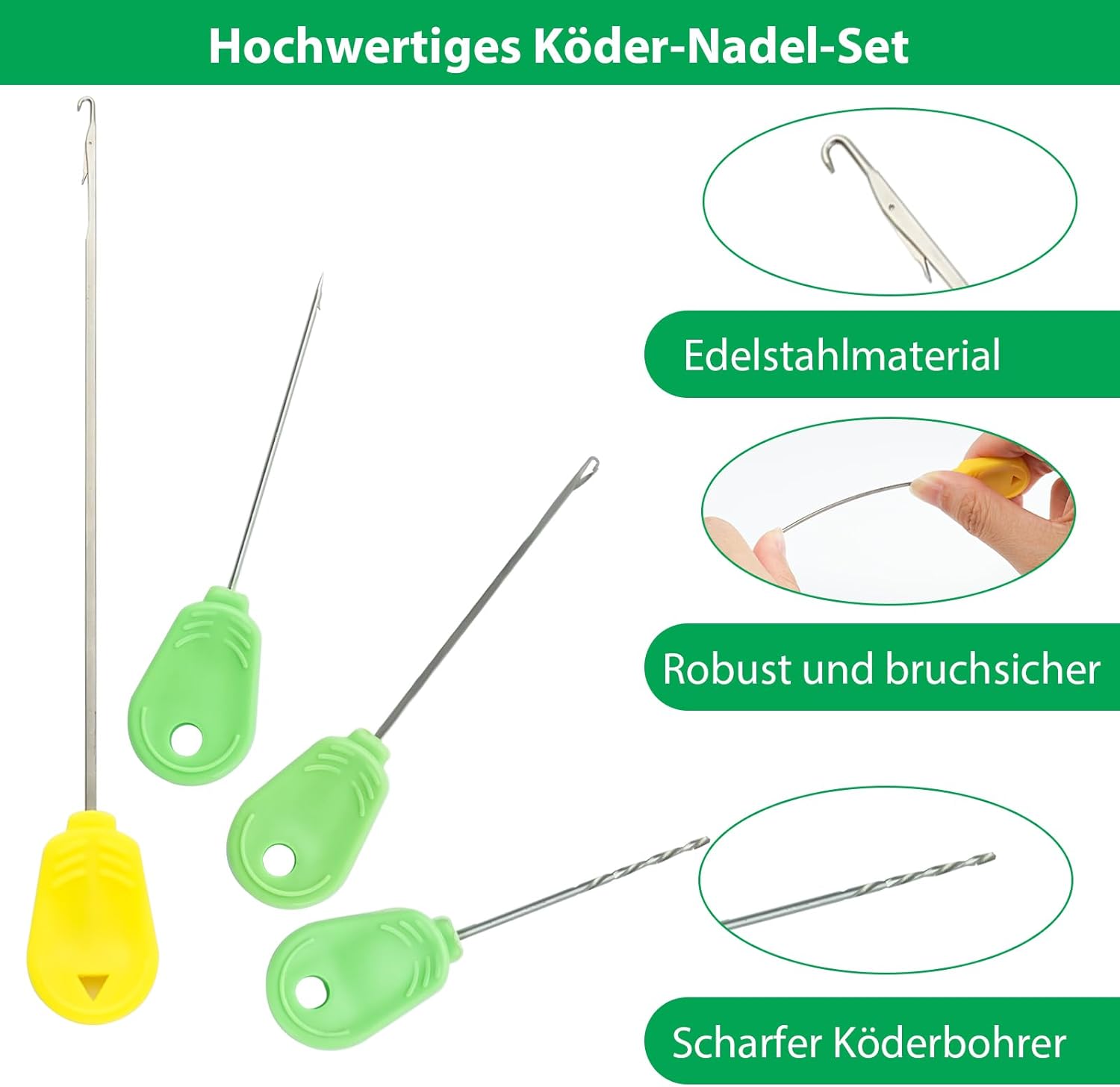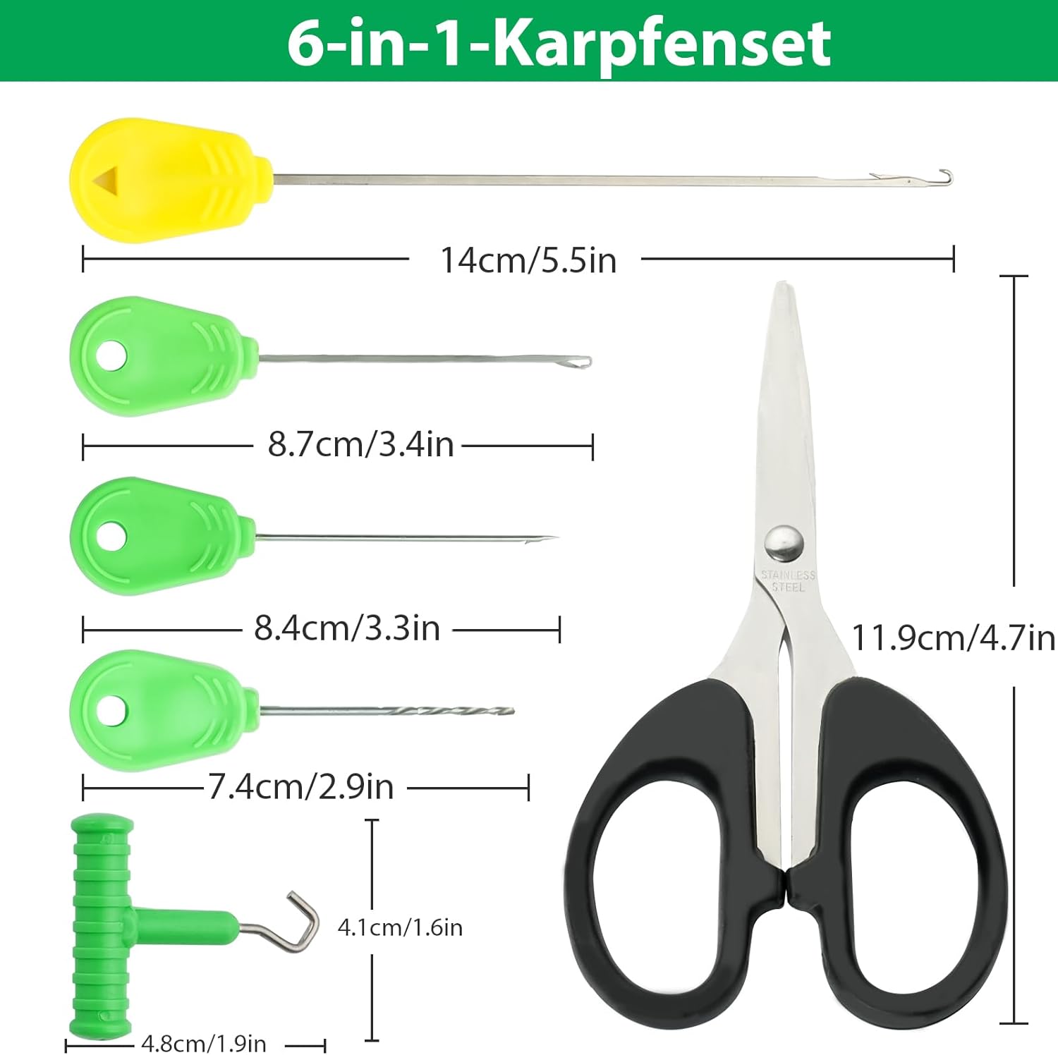 Comprehensive 6-in-1 bait needle set: designed for carp anglers to effortlessly build stable assemblies with 14 cm and 8.7 cm stringers, a cranked needle, a bait drill, a knot puller and line scissors. Optimises bait winding for maximum efficiency in bait needle fishing.