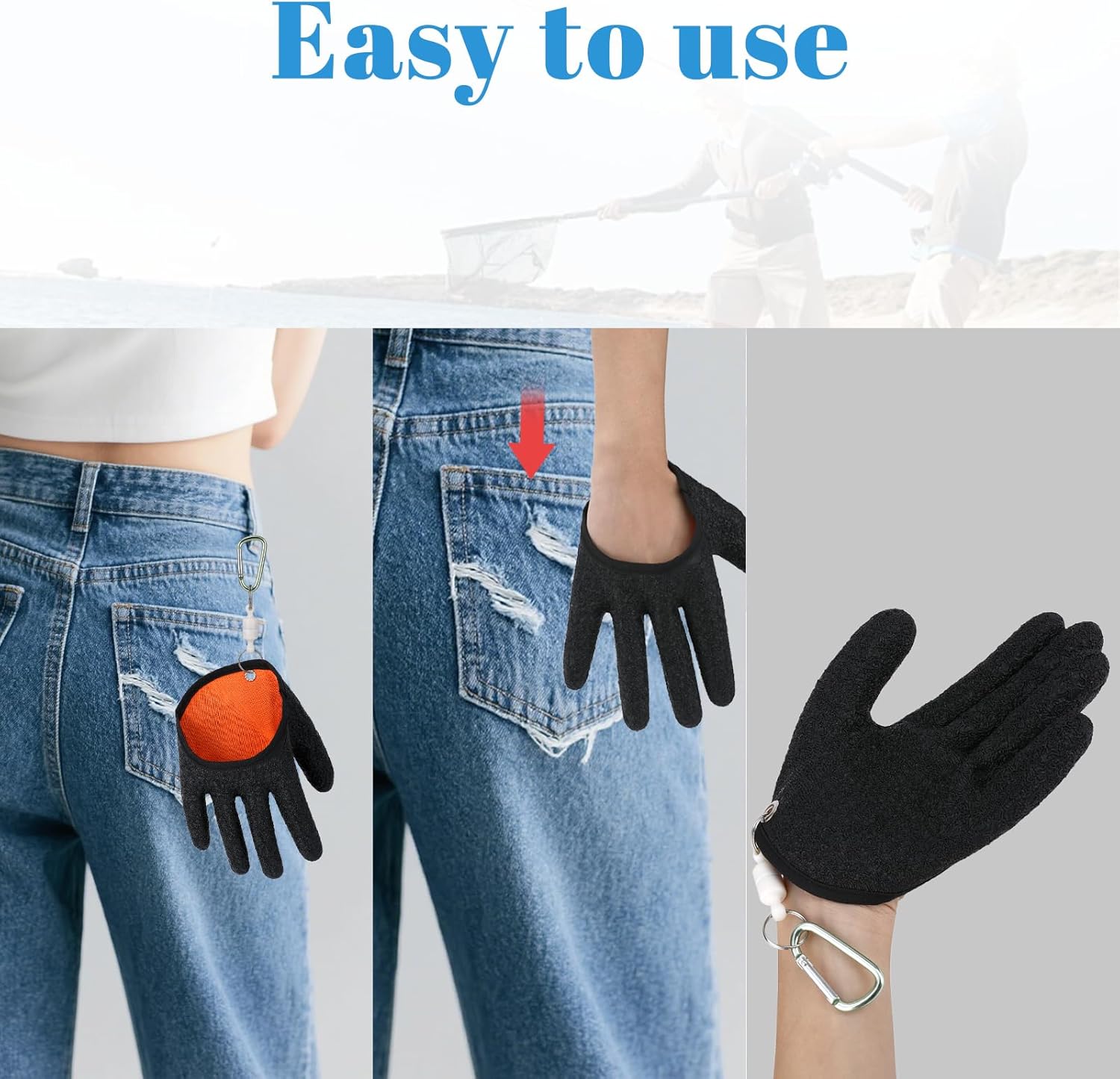 1 pair of fishing gloves (approx. 18 x 13 cm) + 2 magnetic closures, suitable for adults, suitable for hand fishing and outdoor activities.