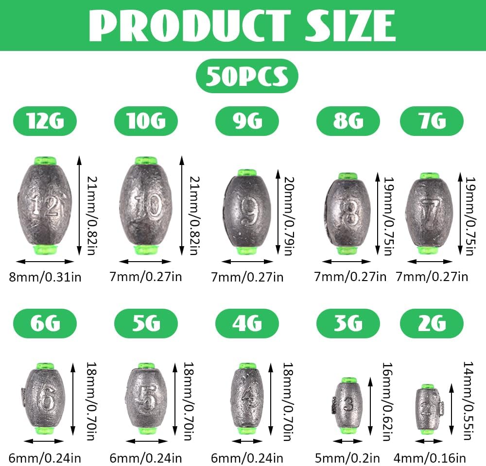 Pack of 50 Removable Fishing Weights, Oval Running Lead Fishing, Reusable Continuous Lead, Rustproof Lead Fishing for Outdoor, Deep Sea Boat Fishing (2g/3g/4g/5g/6g/7g/8g/9g/10g/12g, 10 Sizes)