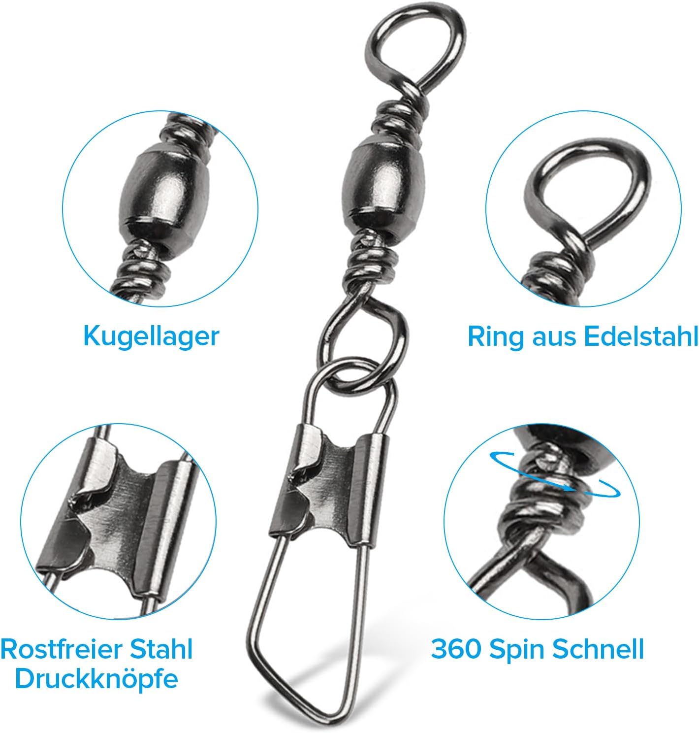 Quick change swivel: This swivel set is a rolling swivel with carabiner that saves you time assembling and securing your device. Our interlocking fishing buckles with snaps help you change lures, leaders, lines and rods in seconds.
