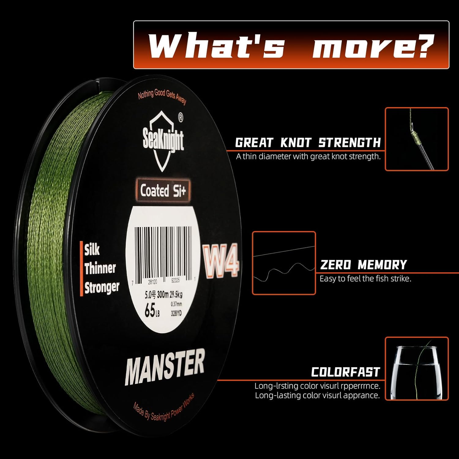 Seaknight W4 Braided Line 4 Strands 300m/500m Super Smooth PE Multifilament Line Carp Fishing Line Double Coating UV Resistant Salt Water Fishing Line for Saltwater 15-80LB