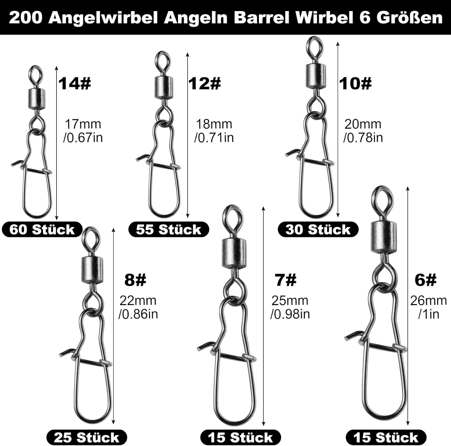 Pack of 100 fishing swivels and clips: This set of fishing swivels contains 100 fishing swivel clips in 6 sizes. They include 10 pieces 6# (26 mm), 10 pieces 7# (25 mm), 20 pieces 8# (22 mm), 20 pieces 10# (20 mm), 20 pieces 12# (18 mm) and 20 pieces 14# (17 mm). They have different maximum tensile strengths to meet your different needs.