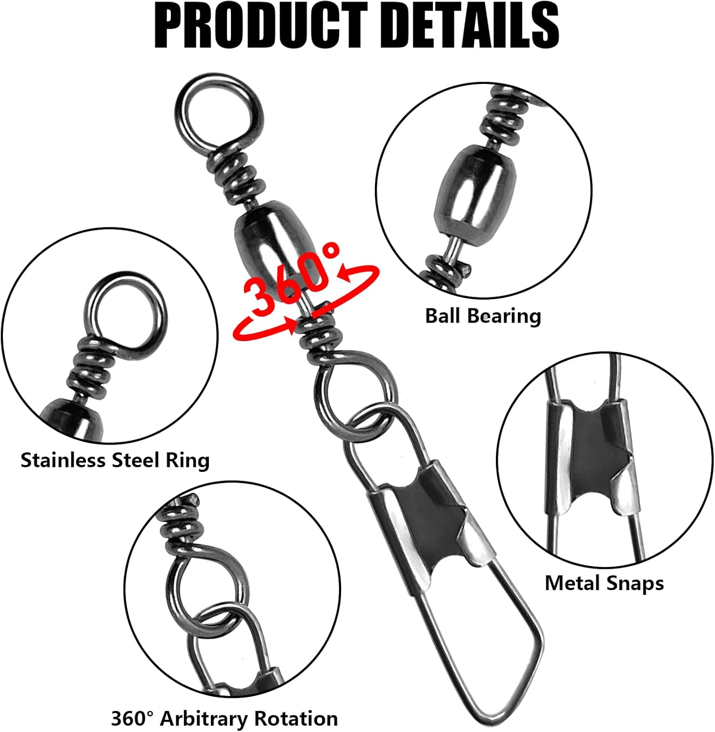 Flexible rolling swivel: fishing snap set adopts the design of a ball bearing swivel that allows different fishing hooks to be easily connected. Both ends can be freely rotated 360 degrees, flexibly releasing the rotation force of the fish on the fishing line, reducing water resistance and avoiding tangling or tangling of the fishing line.